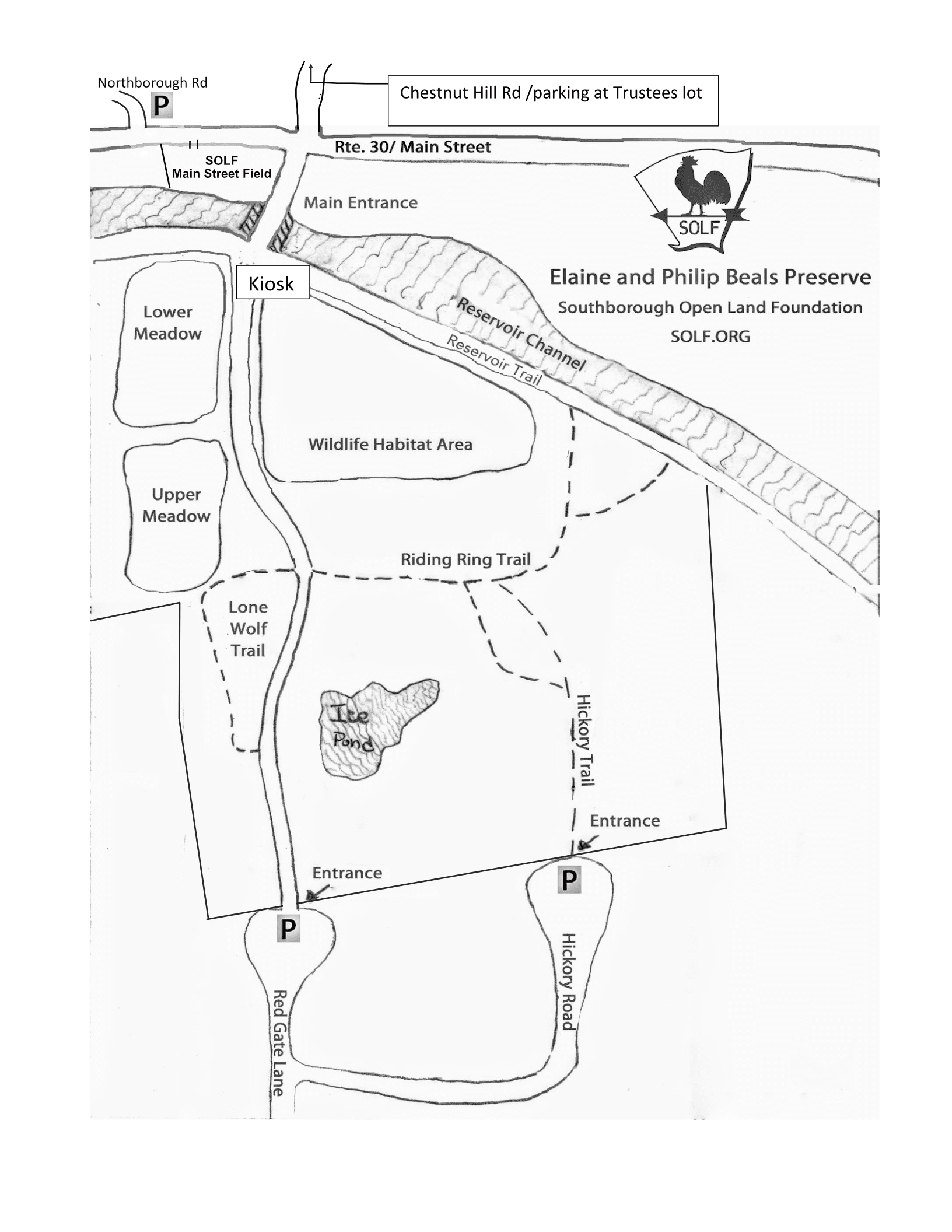 Parking is available at the corner of Route 30 and Old Northboro Road (cross Route 30, walk across field toward small bridge of open channel). You can see the kiosk from this location. We welcome public use from dawn to dusk. Please respect our trail and property use policies: dogs are permitted but must be on leash, and dog waste must be picked up; no bicycles are permitted; no motorized vehicles are permitted. Please be respectful of our neighbors.