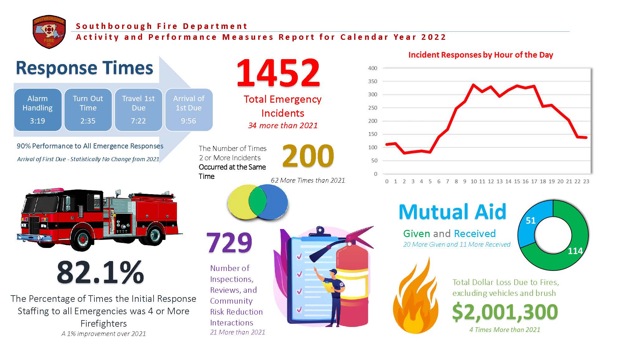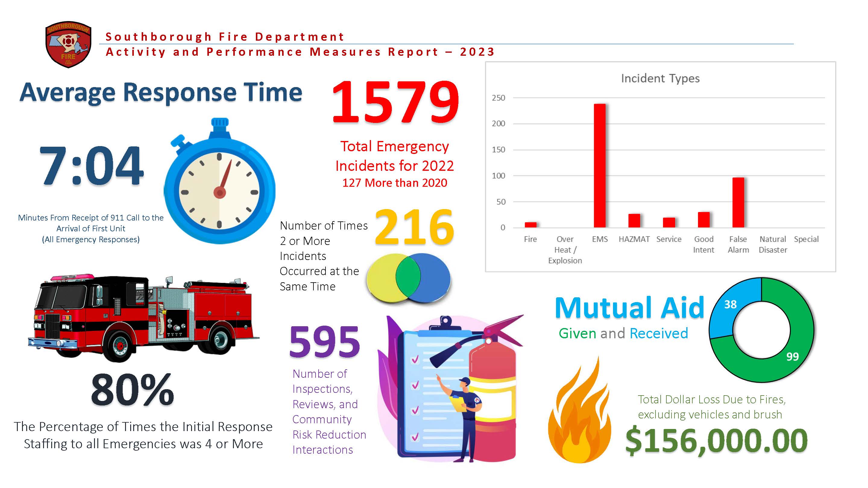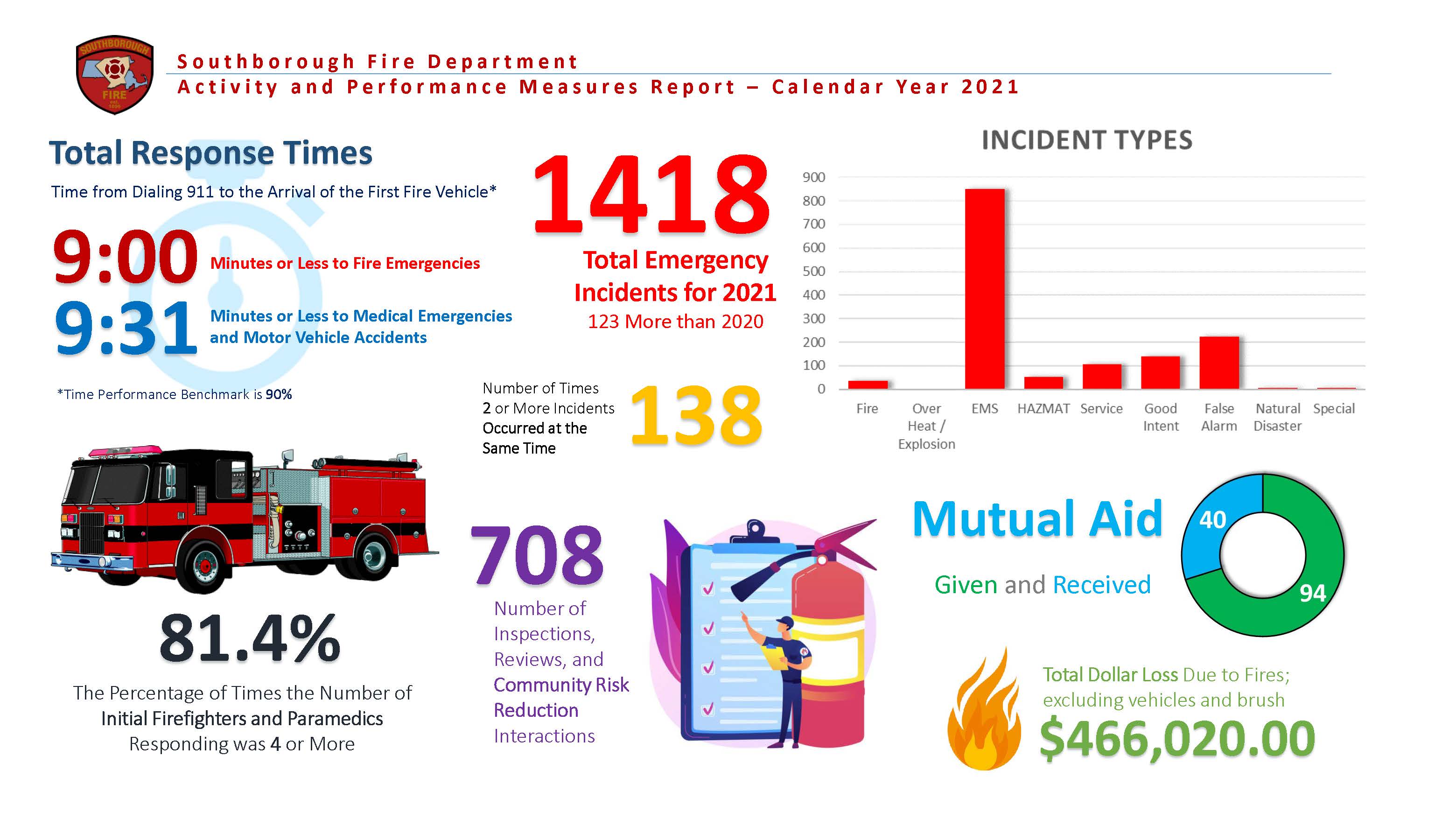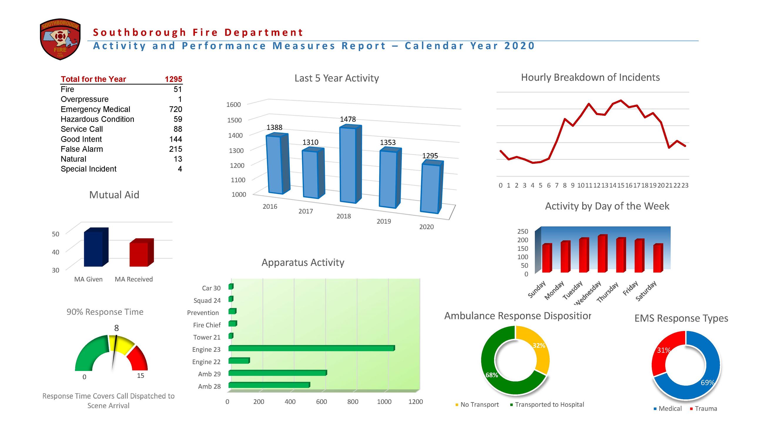 These reports are designed as Dashboards; succinct, easily readable, graphic displays of the department's activity and key performance indicators. It is our goal to provide insight on not only the frequency and type of services the Southborough Fire Department provides to our community but also to the quality of those services.